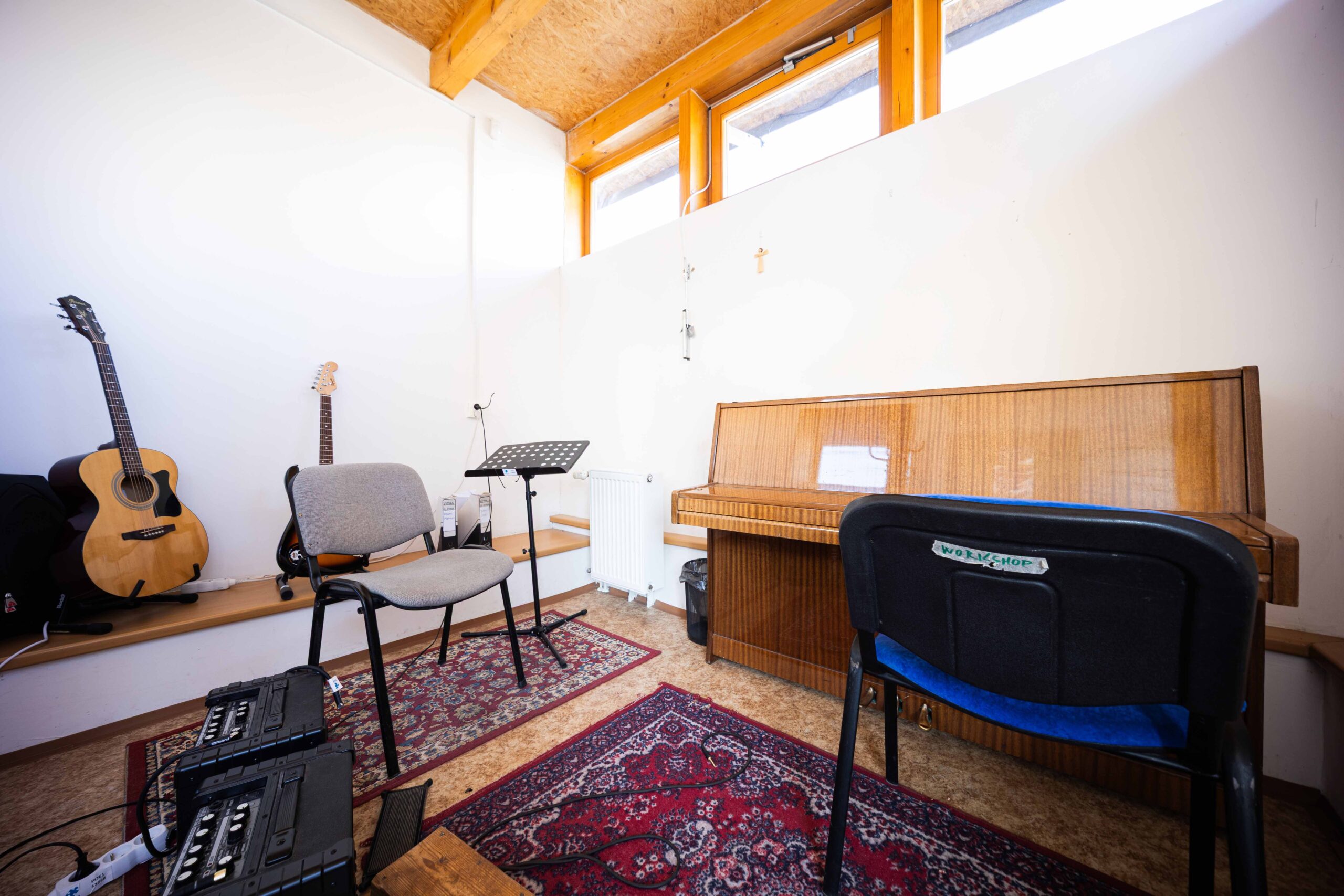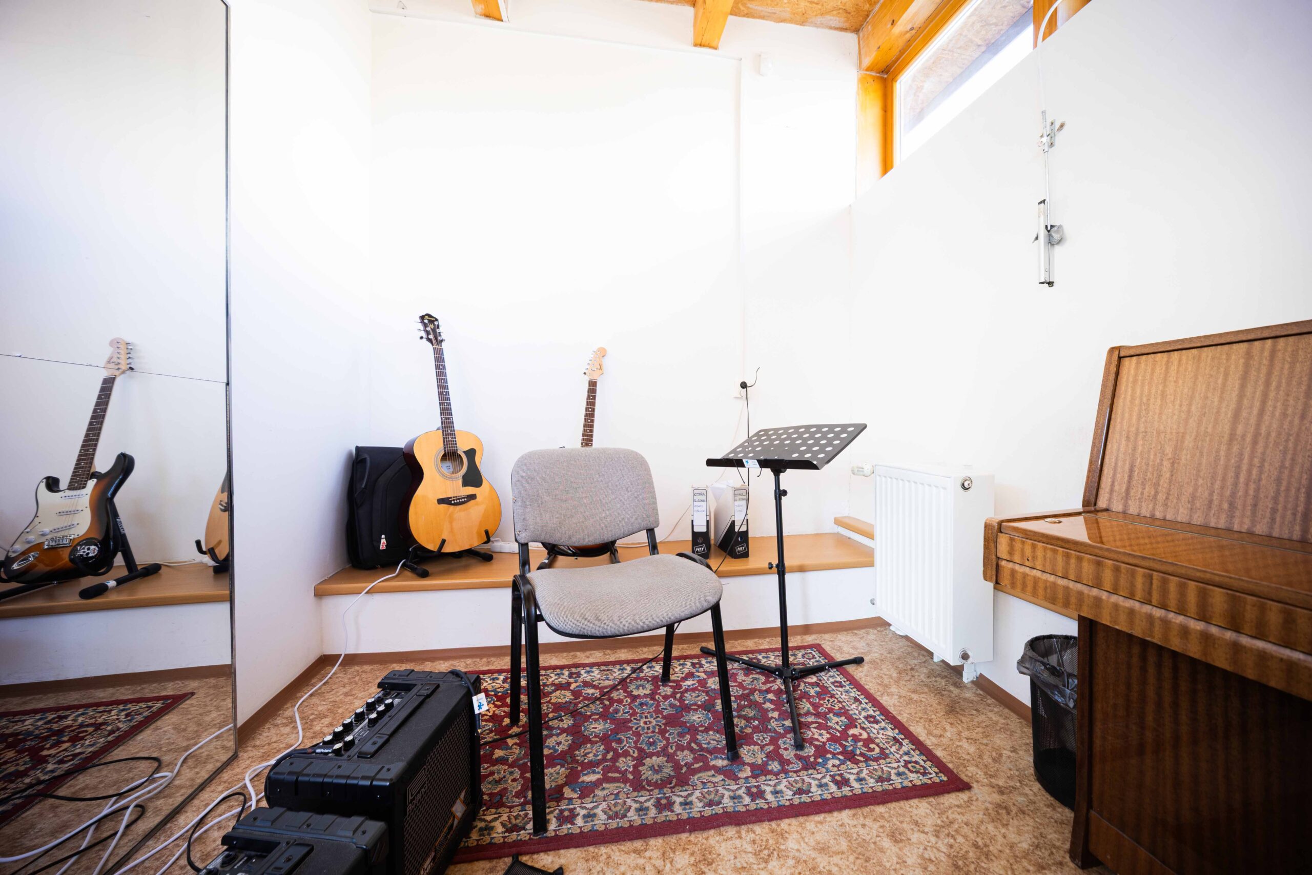 Učebna kytary je součástí kategorie malých učeben (do 8 m²). Tento útulný prostor je určen primárně pro individuální výuku hudby či soukromé cvičení.