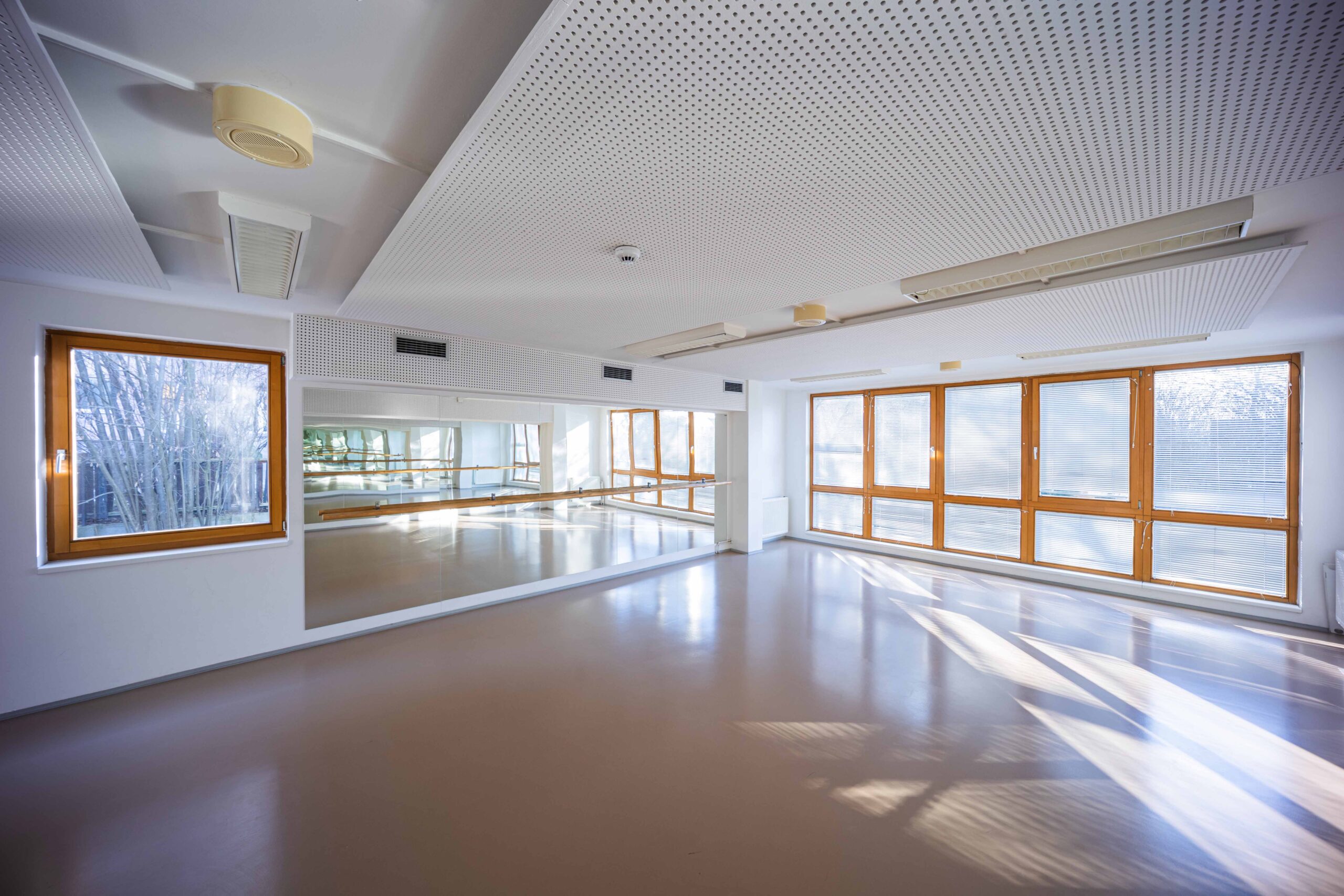 Zrcadlový sál o rozloze 62 m² nabízí kapacitu pro 20 osob. Tento prosvětlený prostor, vybavený zrcadlovou stěnou a baletní tyčí, je ideální volbou pro pořádání pohybových kurzů, jako jsou balet, jóga, pilates, kalanetika a mnoho dalších.
